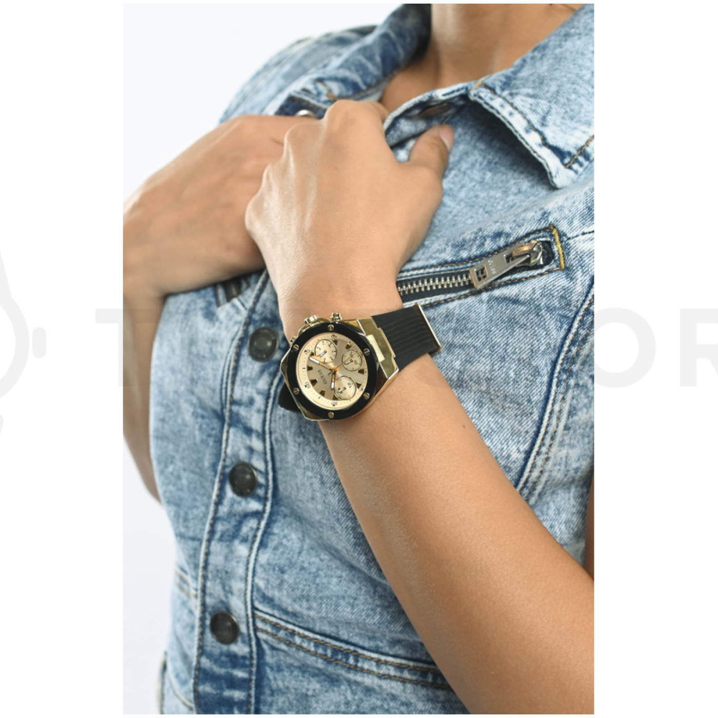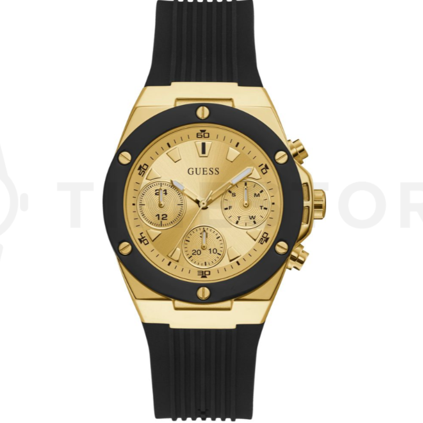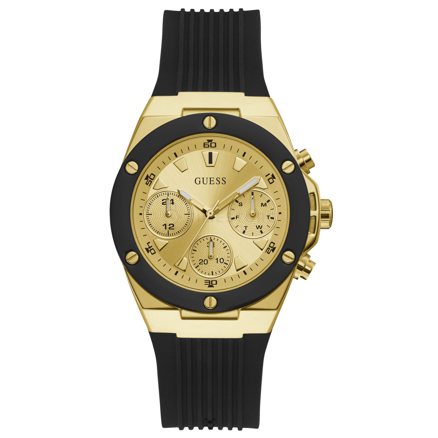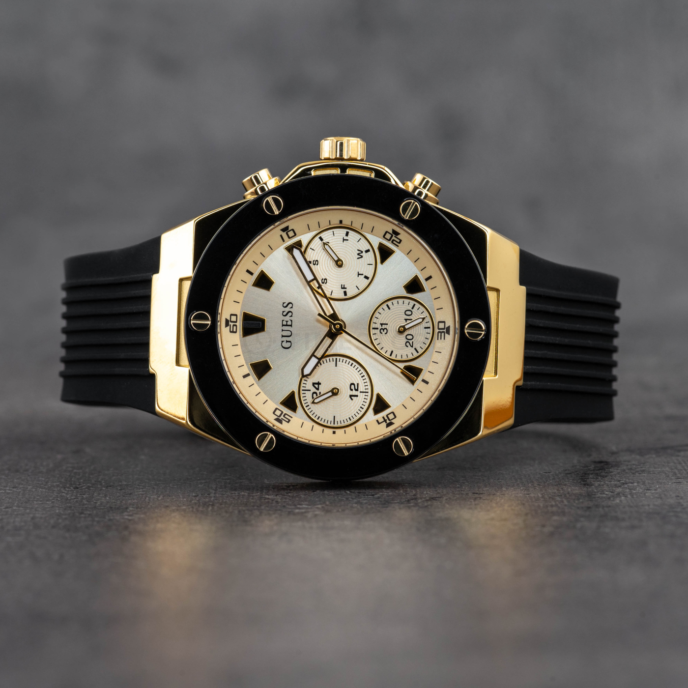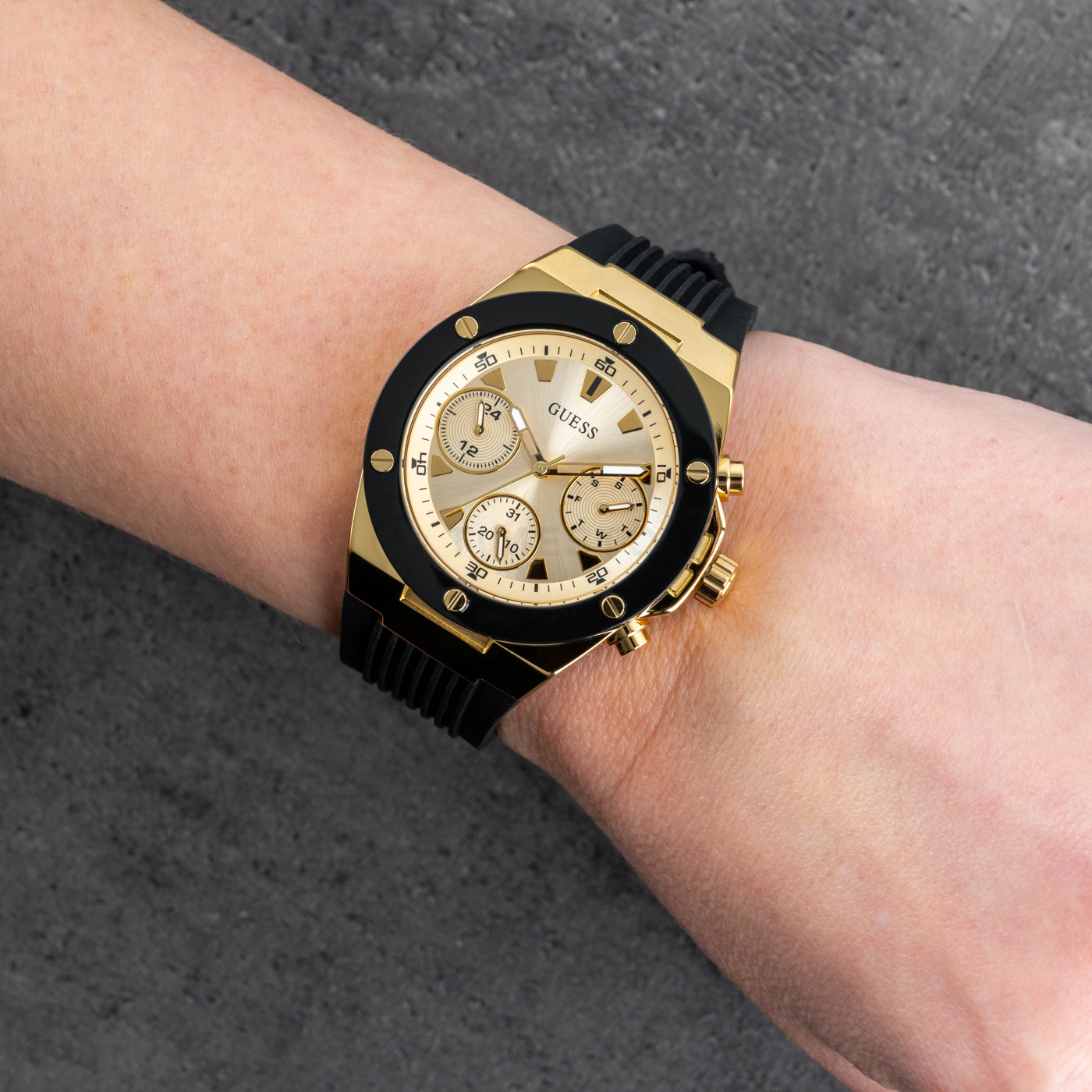 Máte v plánu si koupit půvabné hodinky, které co nejlépe ukáží váš originální styl? Přesně takové jsou totiž hodinky Guess, které vás dostanou. Zobrazený model Guess GW0030L2 zdobí přehledný ciferník, kterého barva je zlatá, přičemž velikost těchto hodinek je 39 x 10 mm. Barva pouzdra je v případě těchto hodinek dvoubarevná ocel, přičemž hlavní materiál, který použil výrobce, je ocel s PVD povlakem. Silikonový řemínek obepínající pouzdro je v pohledné barvě a ta je u modelu GW0030L2 černá. Zbytečně neváhejte, tyto krásné dámské hodinky od Guess jsou skutečně propracovaným modelem.